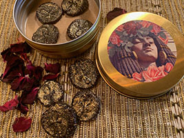 These special cakes are about 1” dia, hand formed and stamped with a golden Ankh. They come in a gold tin . This price is for .6 oz (about 8 cakes)