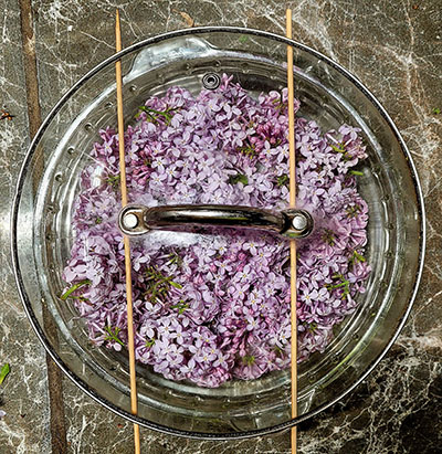 I start enfleuraging during the cool days of spring using Narcissus and Lilac flowers. I gather blossoms in the early morning after the dew has dried off the flowers’ petals. I have hundreds of fragrant Narcissus planted in my forest gardens. I have planted the Narcissus bulbs beneath the runners of Sweetgrass. As the spring winds, shake the world awake. The sweetgrass sends up small flags of seeds on long stems that quiver over the star-rimmed, golden eyes of the narcissus flowers. Their fresh fragrances blend in the breeze, creating a living perfume, the essence of spring. Planting lilacs has long been a tradition in the far north, where hardy, fragrant flowering trees are rare. Taking the time to smell the powdery, pastel, sweetness of Lilac flowers in the air is almost as much of a nostalgic ritual in here in Quebec as Cherry Blossom time in Japan. I only have one, small Lilac tree planted, the moose seemingly loving them as much as me. So, in the villages near the forest, I have come to know where every lilac bush lives and when it blooms. By harvesting the different varieties in succession, the Lilac season for enfleurage, can last almost two months. I have asked many people living around me if I could harvest a few Lilac panicles from their yard. In an affirmation of human generosity, no one has ever refused me.
