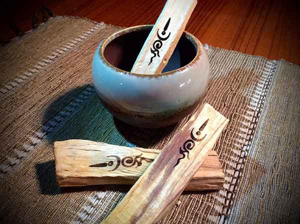- It is nice to have several small ceramic clay bowls or cups half filled with sand or pebbles to hold a stick or two of wood and lighter around your home. We have one in the kitchen and the bathroom to clear and purify the air of odors and bacteria. One in the office to reduce stress and “bad vibes”. One in the living room to bless the home and all who enter. Collecting lovely and meaningful vessels to hold your Palo can add to the décor of your home as well as serving a useful function.