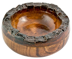 Rustic wooden bowl with natural bark rim.