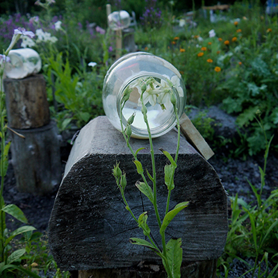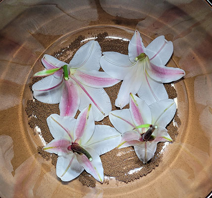 As the days become warmer, I move on to working under the cool, starry nights of summer. Enflueraging and harvesting at night in the dark, my sense of smell is heightened. The world becomes filled with fireflies, strange noises and moon shadows. A time of enchantment and of facing fear. The night blooming flowers are mainly pollinated moths. So, they start to increase their fragrance around crepuscule when the moths shake their furry wings and begin to look for some night life. The Night Blooming Tobaccos start to exhale as soon as the sky starts to color. But, the Giroflee wait until darkness has fully descended. Once a flower is picked, its fragrance starts to change. One of my night-time enfleurage methods involves carrying jars with a thin layer of absorbing material into the garden, bringing the enfleurage jars directly to the flowers rather than picking the blooms. I call this method “Living Enfleurage”. I carefully bend the stems of night flowers into the jars which allows the flowers to release their scent naturally into the jars. In not removing the flowers from the plants, Living Enfleurage is the best way to capture the true to life scent of flowers. Picking the flowers, but keeping them whole, I do traditional enfleurage with Lilies. Picked Lilies loose only their most ethereal top notes. The sensual heart of their fragrance can last for days. I place the flowers, sometimes three or four at a time, in large casseroles directly on the receiving material. Once the blossoms begin to soften and fall apart, as they start to die, I place the petals around my outdoor altar. Even while dying, the Lilies continue to perfume the air. A message about strong spirits leaving beautiful traces that perfume the world even as they fade away.