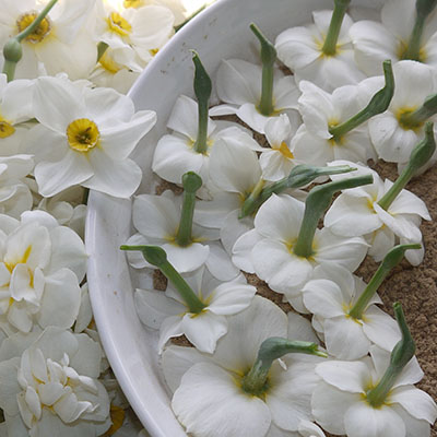 I start enfleuraging during the cool days of spring using Narcissus and Lilac flowers. I gather blossoms in the early morning after the dew has dried off the flowers’ petals. I have hundreds of fragrant Narcissus planted in my forest gardens. I have planted the Narcissus bulbs beneath the runners of Sweetgrass. As the spring winds, shake the world awake. The sweetgrass sends up small flags of seeds on long stems that quiver over the star-rimmed, golden eyes of the narcissus flowers. Their fresh fragrances blend in the breeze, creating a living perfume, the essence of spring. Planting lilacs has long been a tradition in the far north, where hardy, fragrant flowering trees are rare. Taking the time to smell the powdery, pastel, sweetness of Lilac flowers in the air is almost as much of a nostalgic ritual in here in Quebec as Cherry Blossom time in Japan. I only have one, small Lilac tree planted, the moose seemingly loving them as much as me. So, in the villages near the forest, I have come to know where every lilac bush lives and when it blooms. By harvesting the different varieties in succession, the Lilac season for enfleurage, can last almost two months. I have asked many people living around me if I could harvest a few Lilac panicles from their yard. In an affirmation of human generosity, no one has ever refused me.